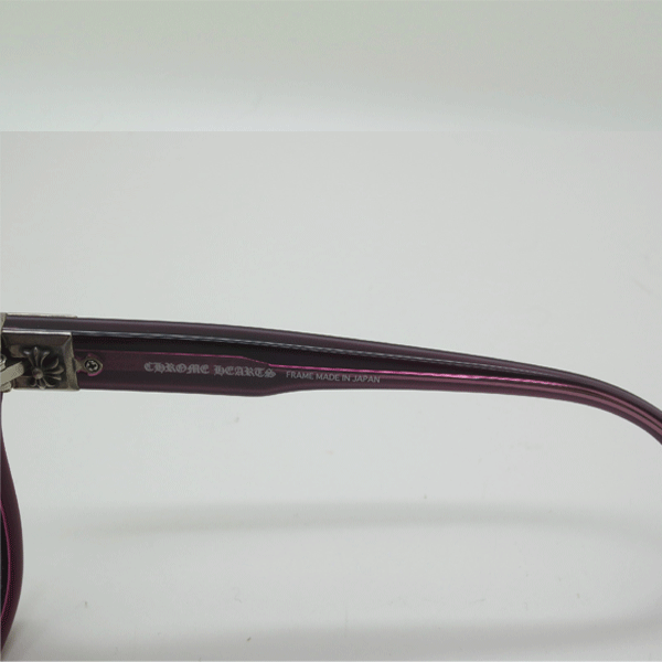 Each pair is handcrafted with precision using highquality acetate, giving the frame a rich, smooth texture and a refined aubergine (deep purple) finish that adds sophistication and depth.The temples feature sterling silver embellishments with chrome hearts’ signature cross and floral engravings, a mark of the brand’s unmatched attention to detail and craftsmanship.