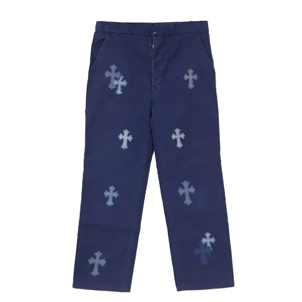 Crafted from premium durable denim or twill, the pants offer both structure and comfort. The classic carpenter-style silhouette, complete with utility pockets and a relaxed fit, is reimagined with Chrome Hearts’ signature detailing. The blue leather cross patch is meticulously stitched onto the pant leg, creating a striking visual focal point and emphasizing the brand’s attention to craftsmanship and detail. The vivid blue tone adds a vibrant contrast to the neutral base, making these pants an instantly recognizable statement piece.