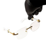 A masterpiece of craftsmanship, these eyeglasses are sculpted from radiant gold toned metal and embellished with Chrome Hearts’ signature silver detailing. Every angle reflects artistry from the engraved temples to the polished bridge echoing the brand’s dedication to luxury and individuality. The frame exudes a royal charm, reminiscent of timeless Indo opulence blended with modern sophistication.
