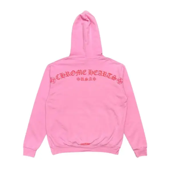 A2: The pink and red combination gives this hoodie a bold yet playful contrast, making it stand out while retaining Chrome Hearts’ signature luxury feel.