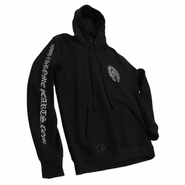 The hoodie includes ribbed cuffs and hem for a snug fit, a kangaroo pocket for convenience, and an adjustable drawstring hood for added versatility. Chrome Hearts’ signature gothic typeface and cross motifs accentuate its luxury identity, ensuring this piece stands out in any streetwear rotation.