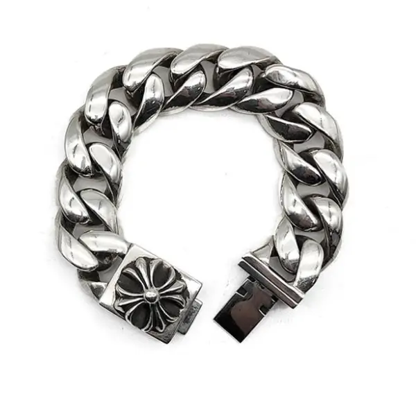 Each Cuba link is polished to a high shine, providing durability and a refined metallic finish that complements the engraved ID plate. The plus cross motif, an iconic symbol of the Chrome Hearts brand, is integrated with precision, highlighting the bracelet’s gothic-inspired aesthetic. This combination of geometric links and symbolic detailing creates a sophisticated, masculine design that transitions seamlessly from casual streetwear to elevated fashion ensembles.