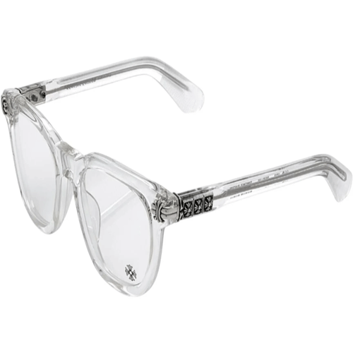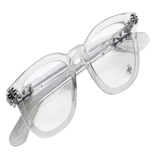 Crafted in Japan with premium quality acetate, these eyeglasses are lightweight yet extremely durable. The crystal-clear frame offers a modern, minimalist look that makes it versatile enough to pair with any outfit. What truly sets this model apart are the intricate Chrome Hearts embellishments sterling silver hardware and engraved detailing that reflect the brand’s gothic, rock-inspired heritage.