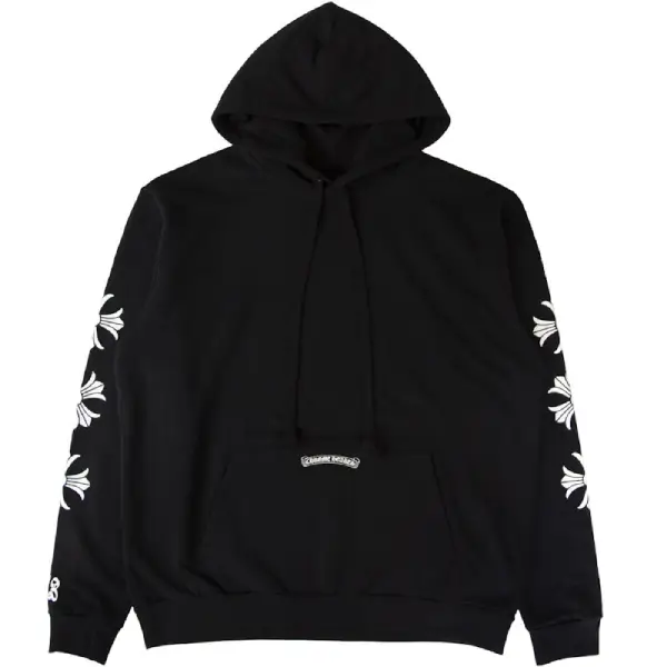 Details: Vertical Chrome Hearts logo print, ribbed cuffs and hem, kangaroo pocket, and adjustable drawstring hood